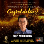 Untuk pengetahuan anda, pin Star Founder Master Dealer ini diberikan apabila seseorang dealer Public Gold itu berjaya mencapai 1,000 orang customer di bawah empayarnya. Ini termasuklah dengan keseluruhan bilangan dealer dan customer di bawah empayar dealer tersebut.